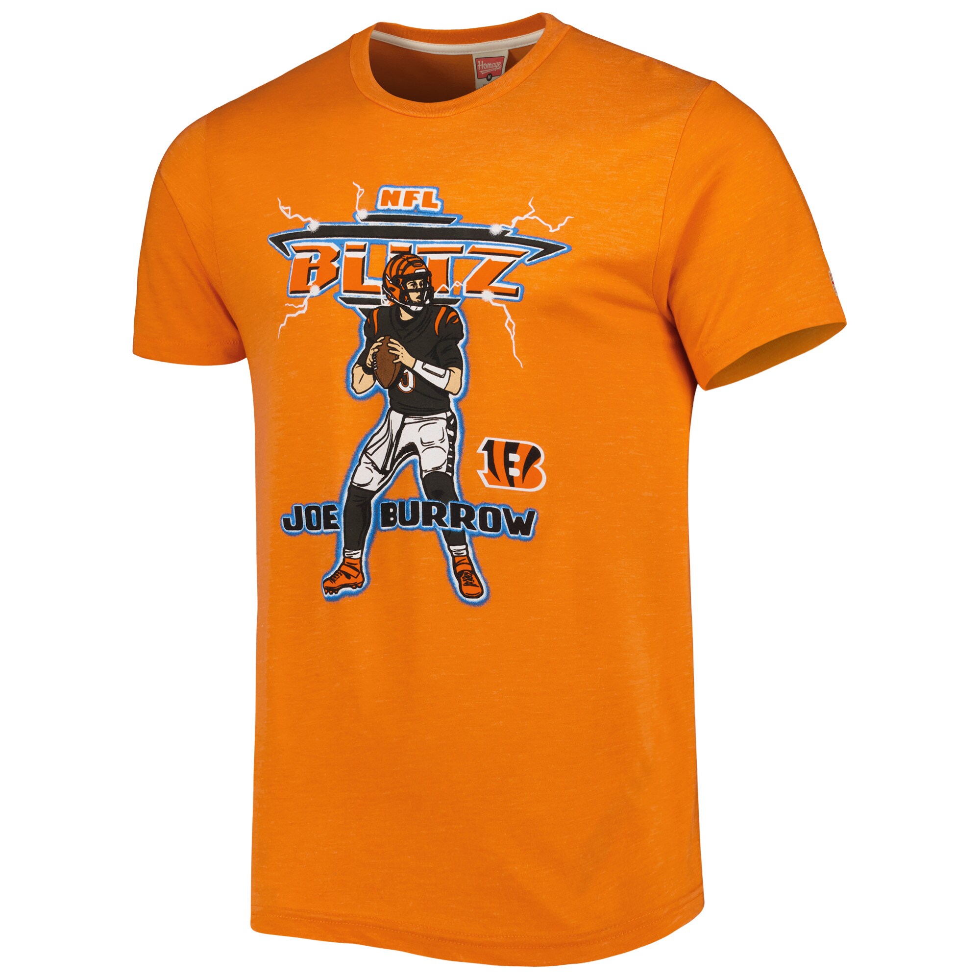 The Men’s Homage Joe Burrow Heathered Heather Orange Cincinnati Bengals NFL Blitz Player Tri-Blend T-Shirt is the perfect way to